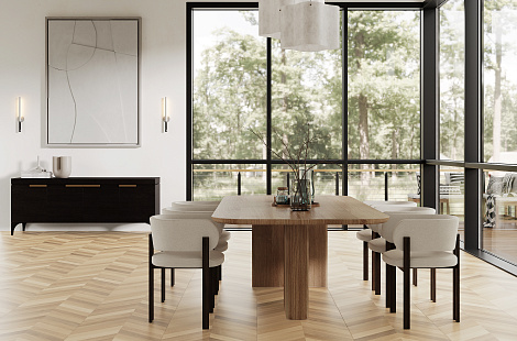 - Отделка под натуральное дерево отлично выглядит в гостиной, прихожей или на кухне. Она полностью идентична паркету, но намного проще в уходе. Такая облицовка хорошо дополняет классический дизайн.